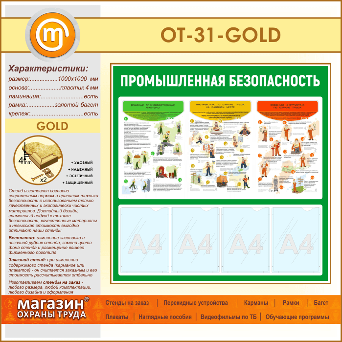 Стенд «Промышленная безопасность» с 4 карманами (OT-31-GOLD) в Альметьевске купить