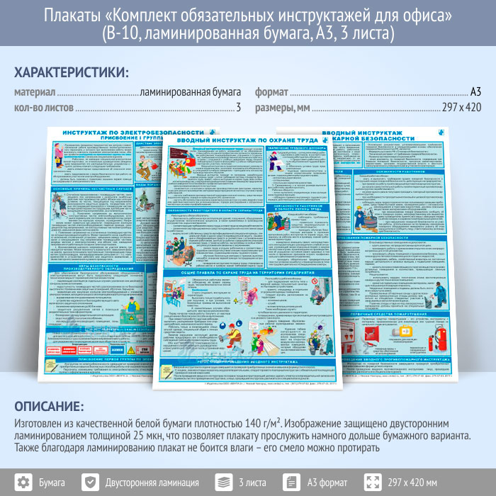 Плакаты «Комплект обязательных инструктажей для офиса» (В-10, ламинированная бумага, А3, 3 листа) в Альметьевске купить