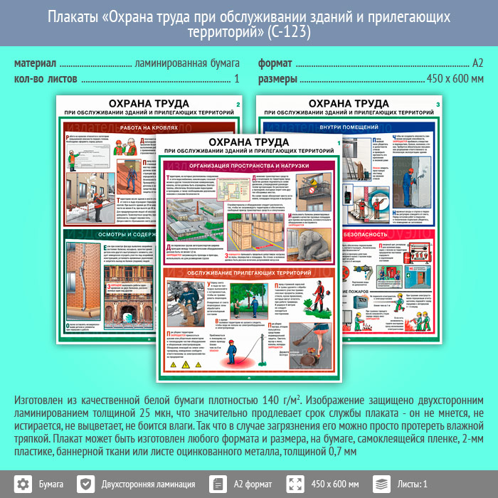Плакаты «Охрана труда при обслуживании зданий и прилегающих территорий» (С-123, ламинированная бумага, А2, 3 листа) в Альметьевске купить