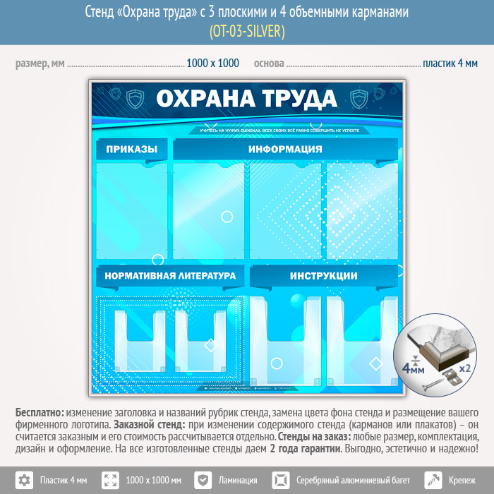 Стенд «Охрана труда» с 4 плоскими и 4 объемными карманами (OT-03-SILVER) в Альметьевске купить