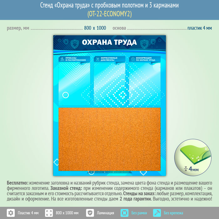 Стенд «Охрана труда» с пробковым полотном и 3 карманами (OT-22-ECONOMY2) в Альметьевске купить