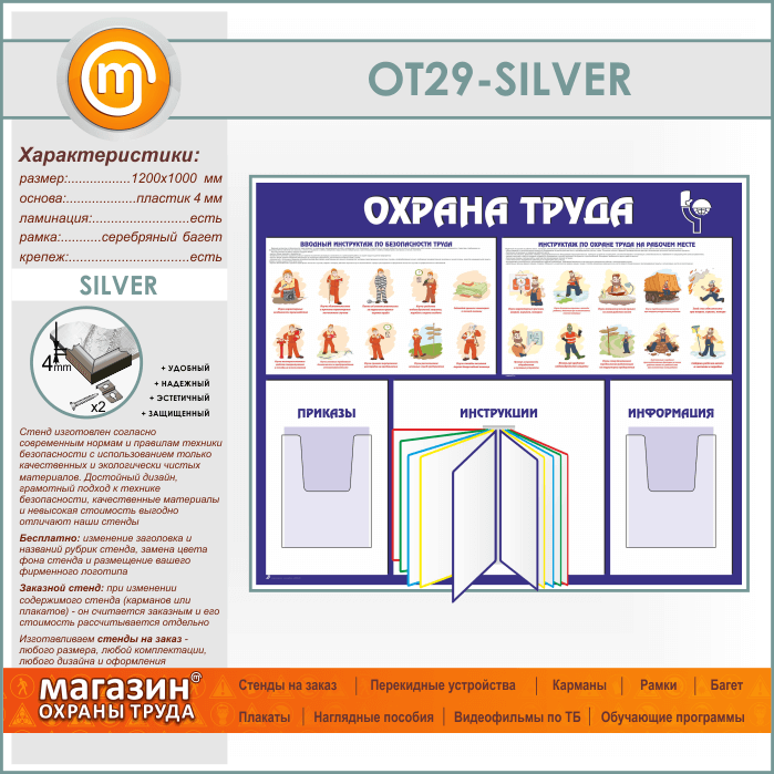 Стенд «Охрана труда» с перекидной системой и 2 объемными карманами (OT-29-SILVER) в Альметьевске купить