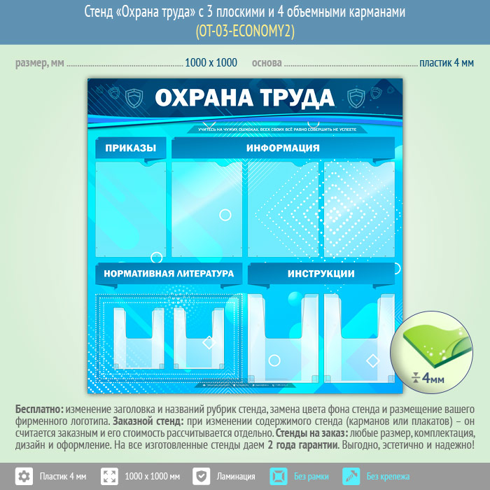 Стенд «Охрана труда» с 4 плоскими и 4 объемными карманами (OT-03-ECONOMY2) в Альметьевске купить