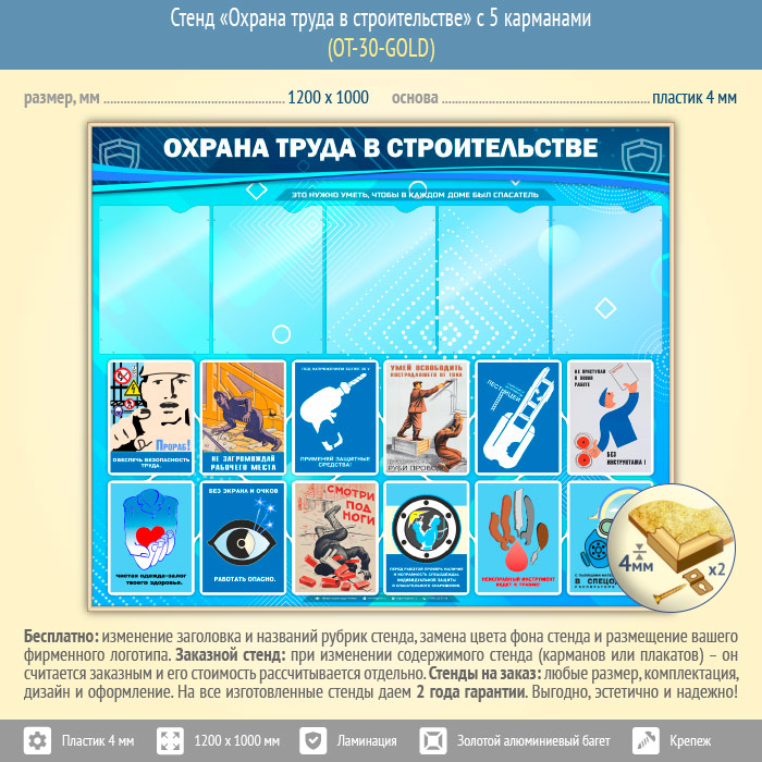 Стенд «Охрана труда в строительстве» с 5 карманами (OT-30-GOLD) в Альметьевске купить