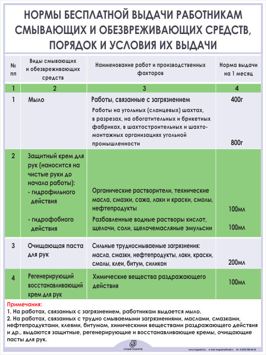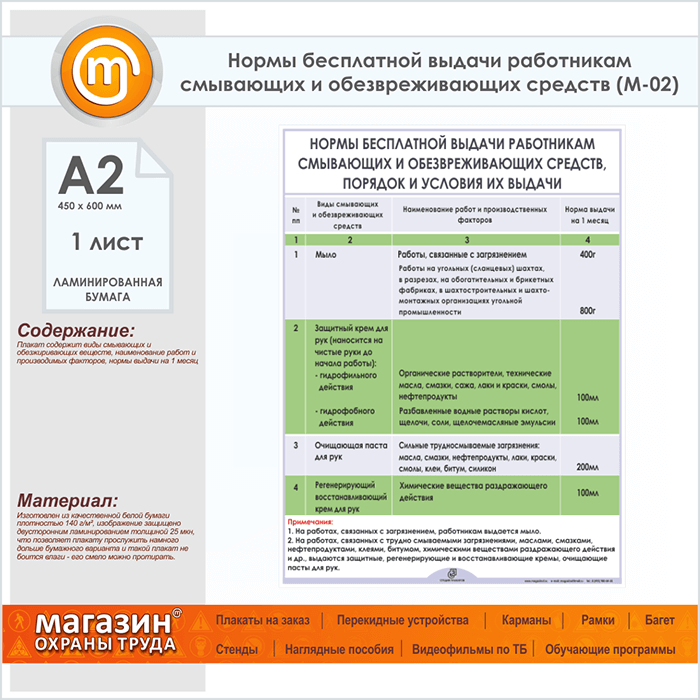 Плакат «Нормы бесплатной выдачи работникам смывающих и обезвреживающих средств» (М-02, ламинированная бумага, А2, 1 лист) в Альметьевске купить