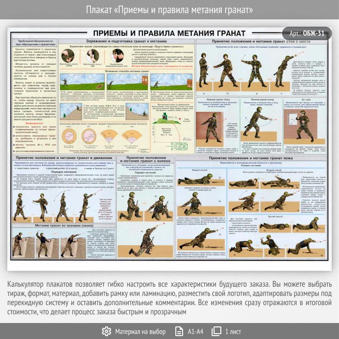 Плакат «Приемы и правила метания гранат» (ОБЖ-31, 1 лист) в Альметьевске купить