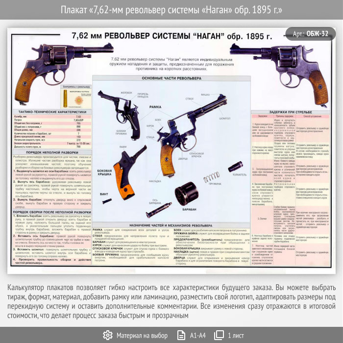 Плакат «7,62-мм револьвер системы «Наган» обр. 1895 г.» (ОБЖ-32, 1 лист) в Альметьевске купить
