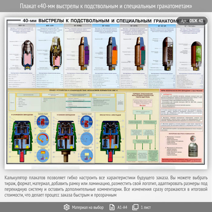 Плакат «40-мм выстрелы к подствольным и специальным гранатометам» (ОБЖ-40, 1 лист) в Альметьевске купить