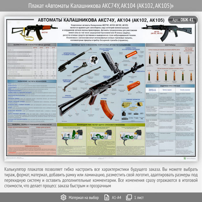 Плакат «Автоматы Калашникова АКС74У, АК104 (АК102, АК105)» (ОБЖ-41, 1 лист) в Альметьевске купить