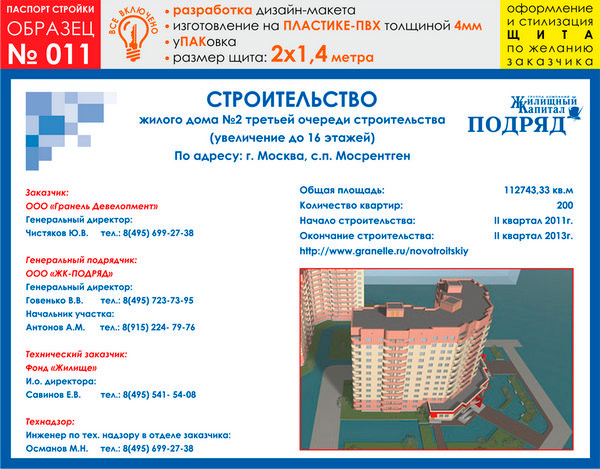 Паспорт стройки, образец № 11 (пластик 4 мм, 2000х1400 cм) в Альметьевске купить