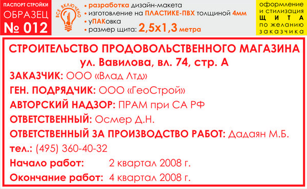 Паспорт стройки, образец № 12 (пластик 4 мм, 2500х1300 cм) в Альметьевске купить