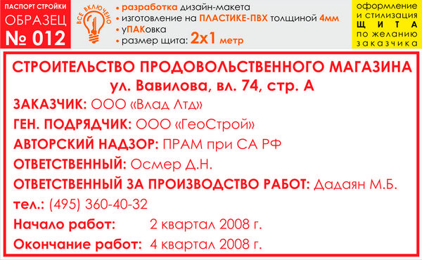 Паспорт стройки, образец № 12 (пластик 4 мм, 2000х1000 cм) в Альметьевске купить