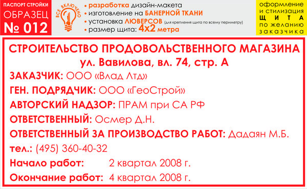 Паспорт стройки, образец № 12 (баннерная ткань, 4000х2000 cм) в Альметьевске купить
