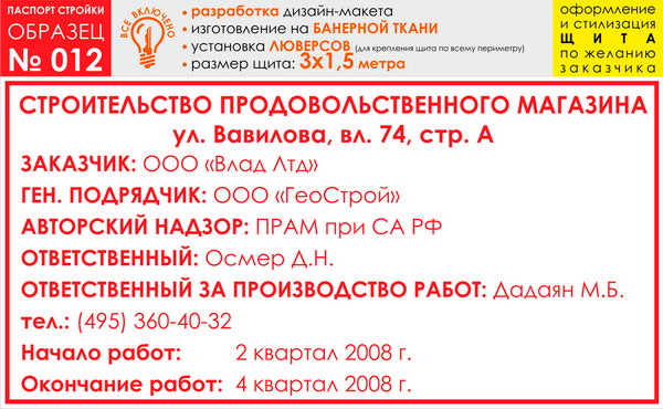 Паспорт стройки, образец № 12 (баннерная ткань, 3000х1500 cм) в Альметьевске купить