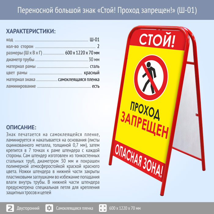 Переносной большой знак «Стой! Проход запрещен!» (Ш-01, двусторонний, самоклеящаяся пленка) в Альметьевске купить