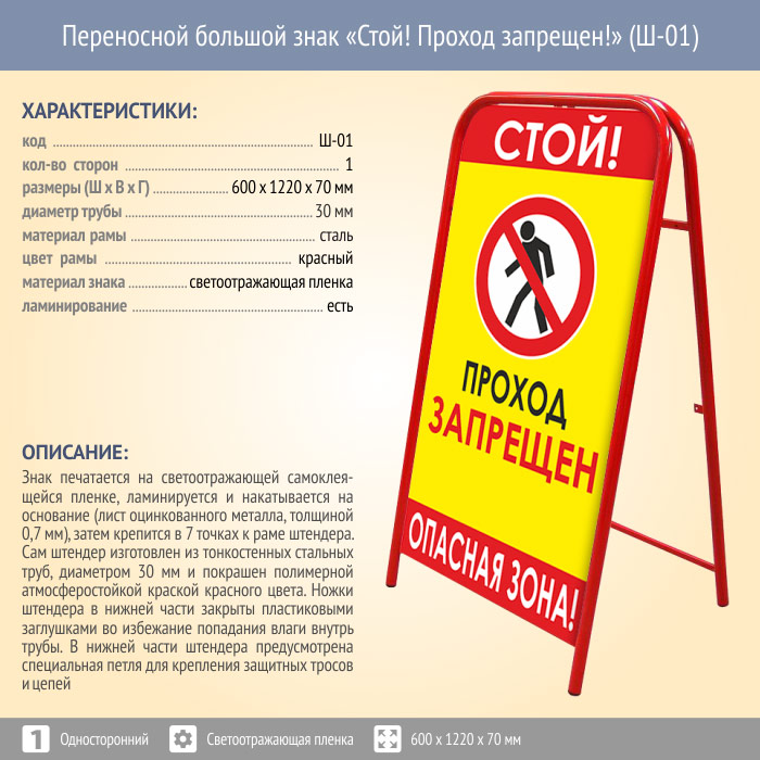 Переносной большой знак «Стой! Проход запрещен!» (Ш-01, односторонний, светоотражающая пленка) в Альметьевске купить