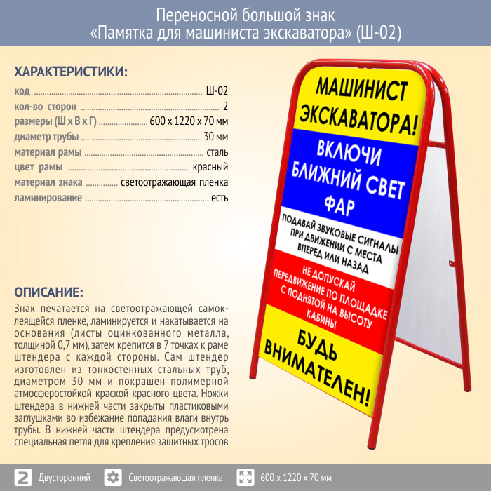 Переносной большой знак «Памятка для машиниста экскаватора» (Ш-02, двусторонний, светоотражающая пленка) в Альметьевске купить