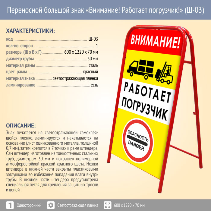 Переносной большой знак «Внимание! Работает погрузчик!» (Ш-03, односторонний, светоотражающая пленка) в Альметьевске купить