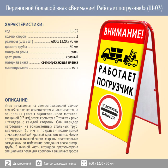 Переносной большой знак «Внимание! Работает погрузчик!» (Ш-03, двусторонний, светоотражающая пленка) в Альметьевске купить