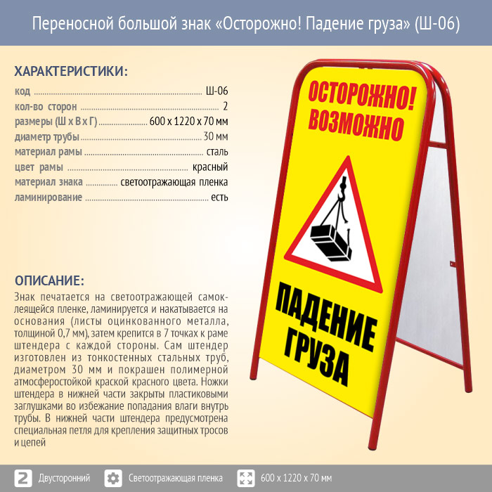 Переносной большой знак «Осторожно! Падение груза» (Ш-06, двусторонний, светоотражающая пленка) в Альметьевске купить