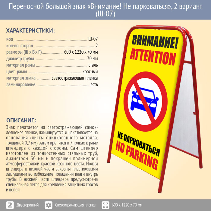 Переносной большой знак «Внимание! Не парковаться», 2 вариант (Ш-07, двусторонний, светоотражающая пленка) в Альметьевске купить