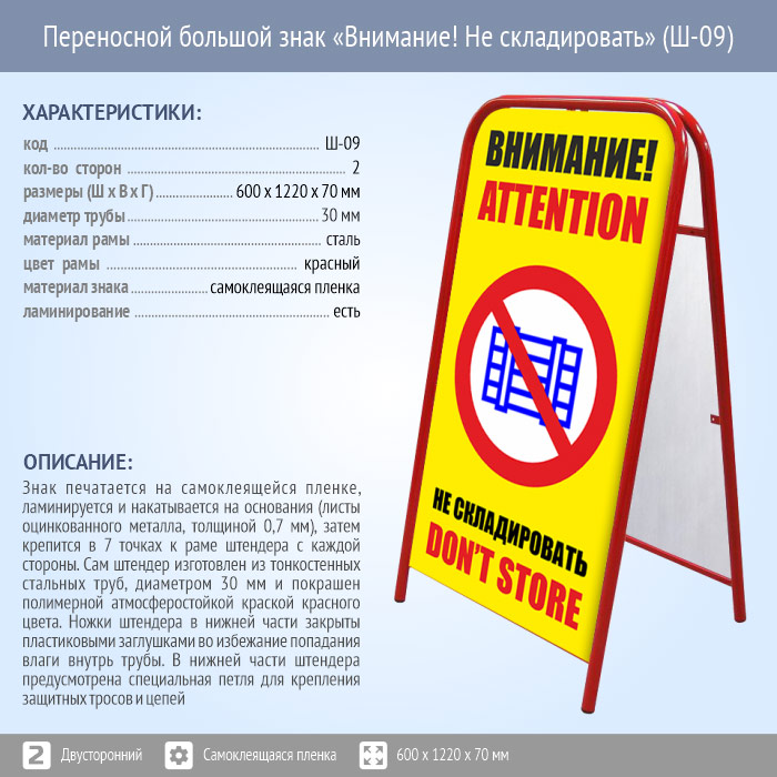 Переносной большой знак «Внимание! Не складировать» (Ш-09, двусторонний, самоклеящаяся пленка) в Альметьевске купить