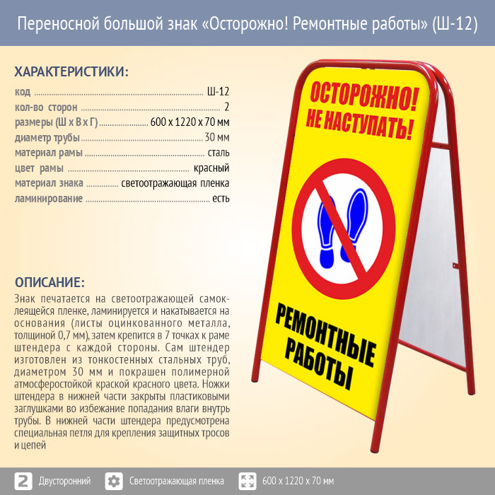 Переносной большой знак «Осторожно! Ремонтные работы» (Ш-12, двусторонний, светоотражающая пленка) в Альметьевске купить