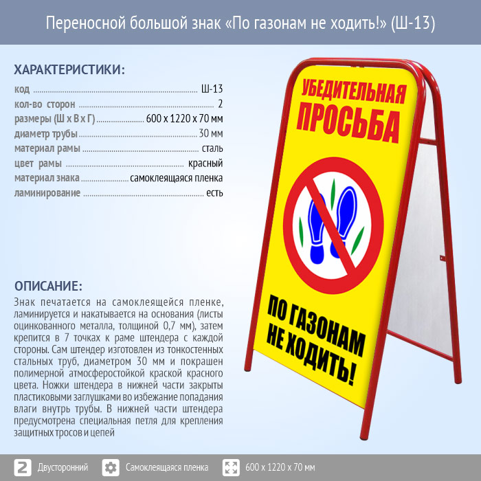 Переносной большой знак «По газонам не ходить!» (Ш-13, двусторонний, самоклеящаяся пленка) в Альметьевске купить