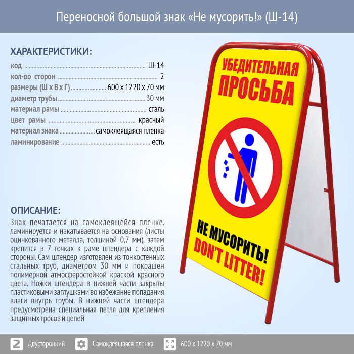 Переносной большой знак «Не мусорить!» (Ш-14, двусторонний, самоклеящаяся пленка) в Альметьевске купить