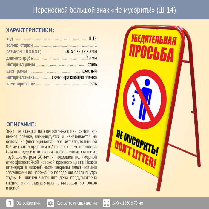 Переносной большой знак «Не мусорить!» (Ш-14, односторонний, светоотражающая пленка) в Альметьевске купить