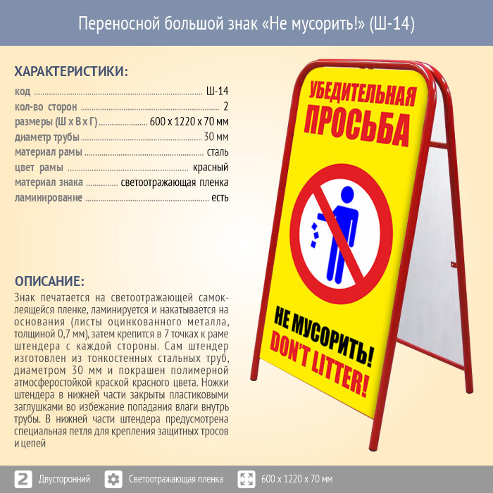 Переносной большой знак «Не мусорить!» (Ш-14, двусторонний, светоотражающая пленка) в Альметьевске купить