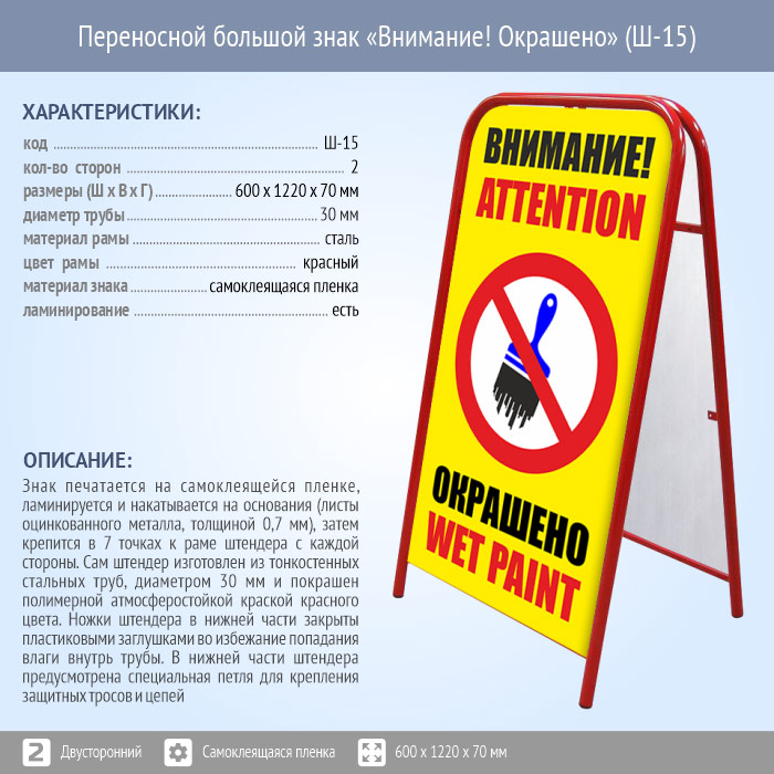 Переносной большой знак «Внимание! Окрашено» (Ш-15, двусторонний, самоклеящаяся пленка) в Альметьевске купить