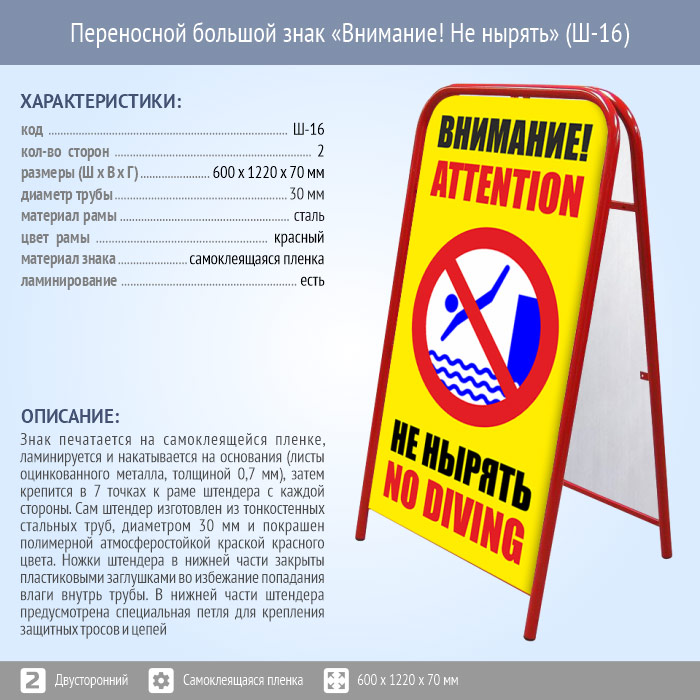 Переносной большой знак «Внимание! Не нырять» (Ш-16, двусторонний, самоклеящаяся пленка) в Альметьевске купить