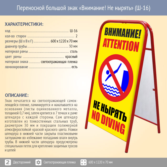 Переносной большой знак «Внимание! Не нырять» (Ш-16, двусторонний, светоотражающая пленка) в Альметьевске купить