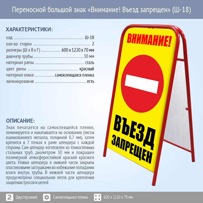 Переносной большой знак «Внимание! Въезд запрещен» (Ш-18, двусторонний, самоклеящаяся пленка) в Альметьевске купить
