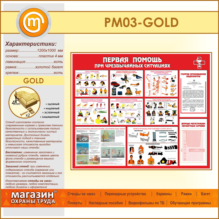 Стенд «Первая помощь при чрезвычайных ситуациях» с плоским и объемным карманами (PM-03-GOLD) в Альметьевске купить
