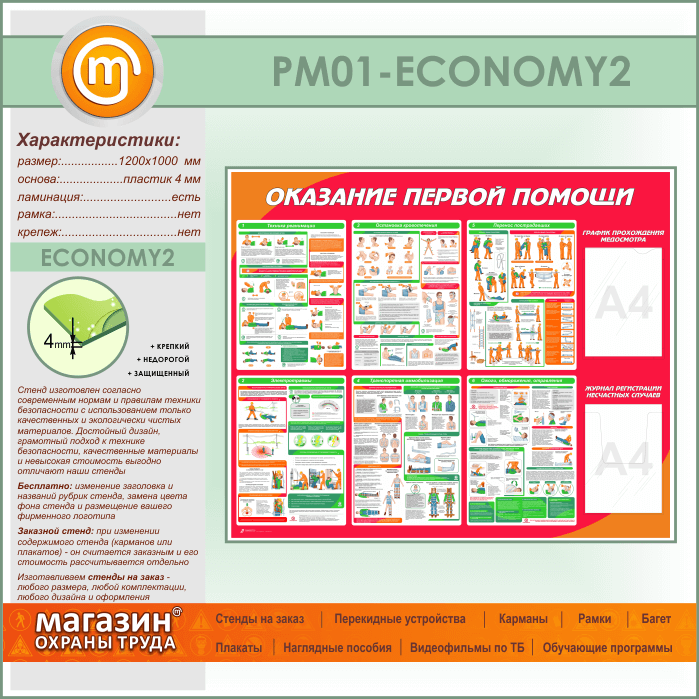 Стенд «Оказание первой помощи» с плоским и объемным карманами (PM-01-ECONOMY2) в Альметьевске купить