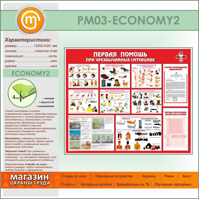 Стенд «Первая помощь при чрезвычайных ситуациях» с плоским и объемным карманами (PM-03-ECONOMY2) в Альметьевске купить