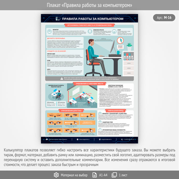 Плакат «Правила работы за компьютером» содержит свежую, актуальную информацию о правилах работы за ПК. При разработке плаката информация бралась не только из СанПиН 2.2.2/2.4.1340-03 "Гигиенические требования к персональным электронно-вычислительным машинам и организации работы", но и из международных источников. Из данного плаката вы узнаете о правильной позе, эргономике рабочего места, периодичности перерывов в работе, требованиях к рабочему месту согласно выше озвученному СанПиН, об упражнениях для снятия усталости глаз и о способах уменьшить вредное влияние от использования ПК
