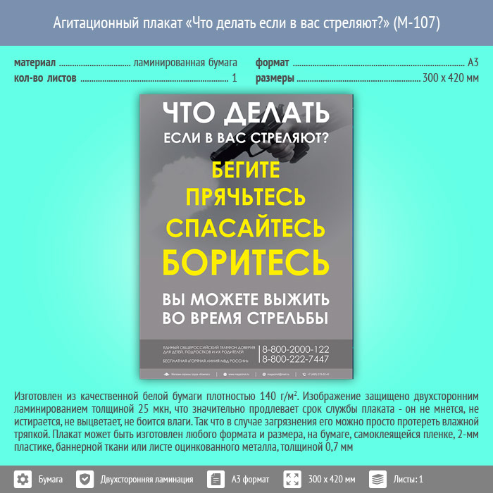 Плакат «Что делать если в вас стреляют?» (М-107, ламинированная бумага, А3, 1 лист) в Альметьевске купить