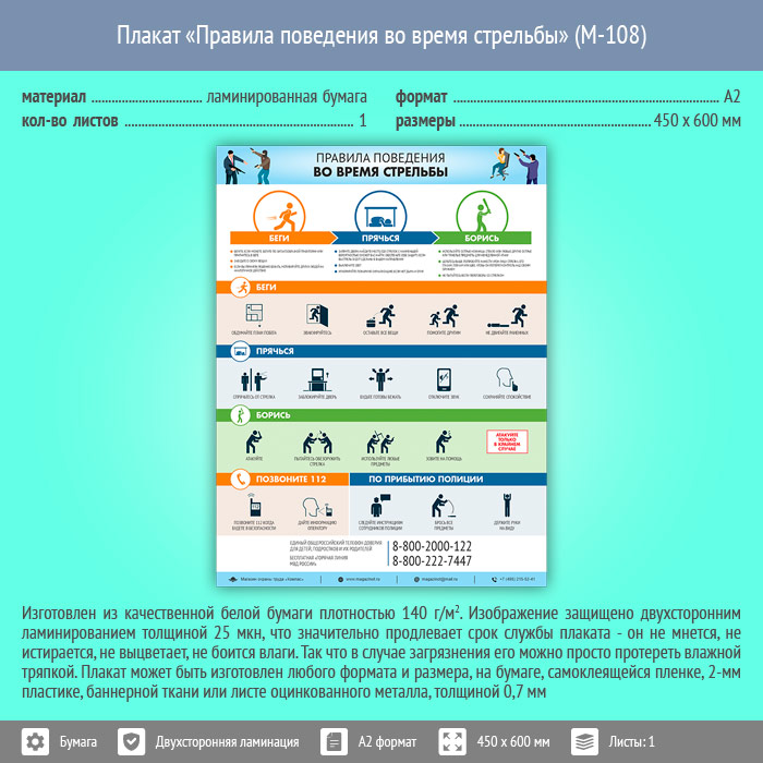 Плакат «Правила поведения во время стрельбы» (М-108, ламинированная бумага, А2, 1 лист) в Альметьевске купить