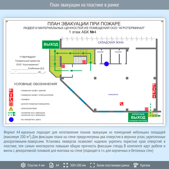 Предлагаем изготовление планов эвакуации А4-А0 форматов. В стоимость изготовления планов эвакуации на пластике в рамке входит: разработка и согласование макета, прямая УФ-печать на 4-мм пластике с последующим обрамлением в белый пластиковый багет