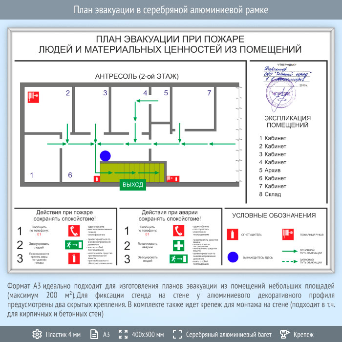 План эвакуации в серебряной алюминиевой рамке (А3 формат) в Альметьевске купить