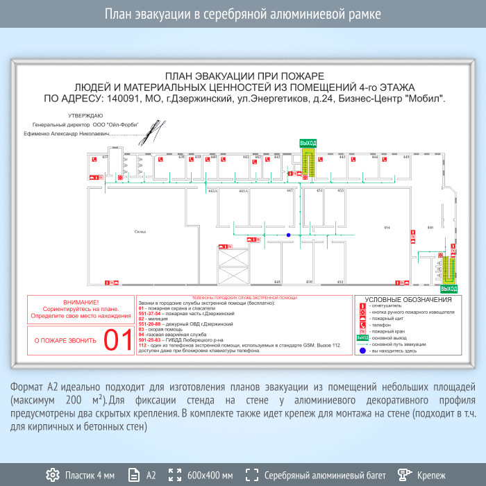 План эвакуации в серебряной алюминиевой рамке (А2 формат) в Альметьевске купить