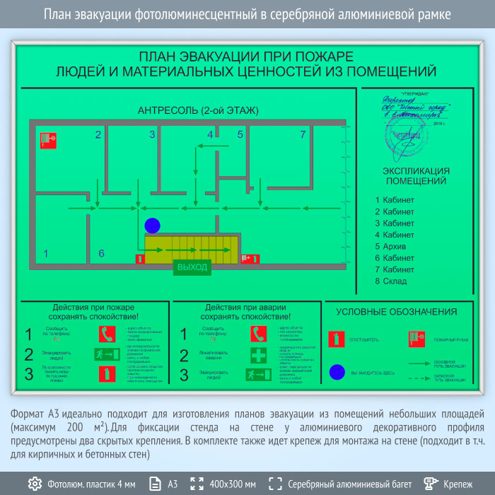 План эвакуации фотолюминесцентный в серебряной алюминиевой рамке (А3 формат) в Альметьевске купить