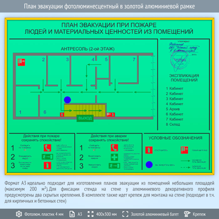 План эвакуации фотолюминесцентный в золотой алюминиевой рамке (А3 формат) в Альметьевске купить
