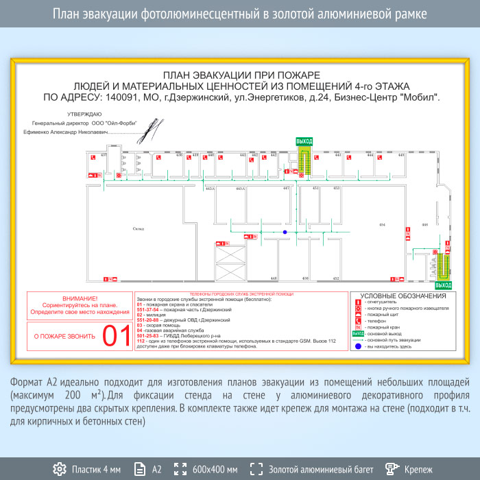 План эвакуации в золотой алюминиевой рамке (А2 формат) в Альметьевске купить
