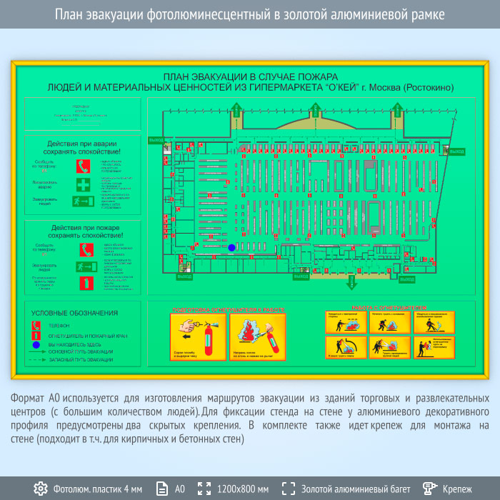 План эвакуации фотолюминесцентный в золотой алюминиевой рамке (А0 формат) в Альметьевске купить