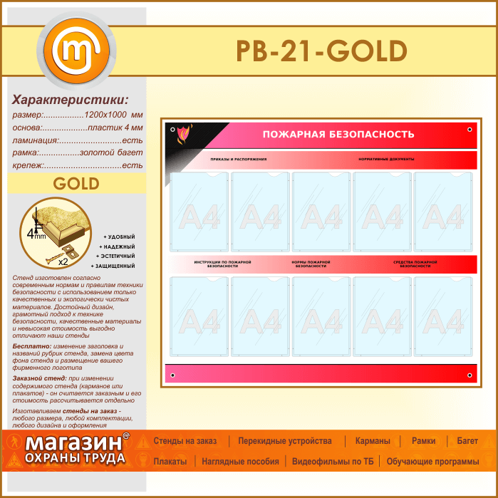 Стенд «Пожарная безопасность» с 10 карманами (PB-21-GOLD) в Альметьевске купить
