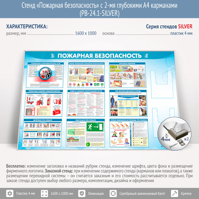 Стенд «Пожарная безопасность» с 2-мя глубокими А4 карманами (PB-24.1-SILVER) в Альметьевске купить
